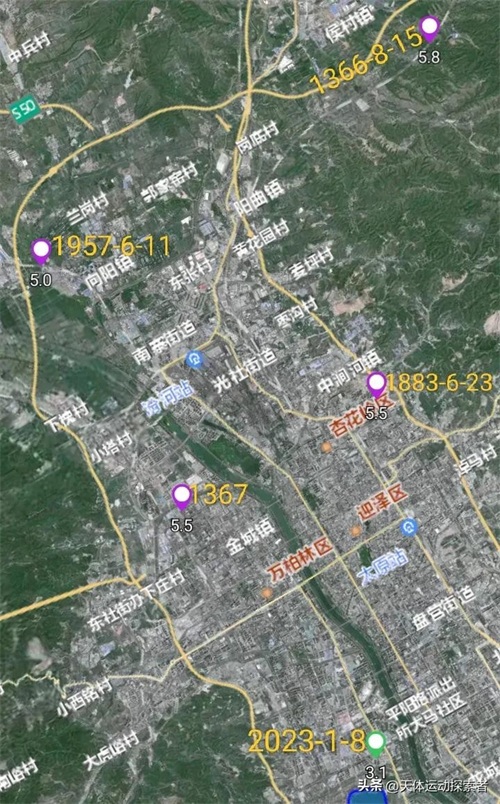 1679年10月太原市清徐县北录树村一带5.5级,距2023年11月30日3.7级震中8公里左右。