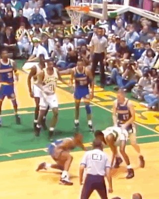 1996年西部决赛超音速和爵士的7场大战在当时联盟新老两位顶尖大前锋的对抗中展开。“雨人”坎普用他超人的弹跳和不讲理的野兽派打法击败了一身横练功夫的卡尔·马龙。