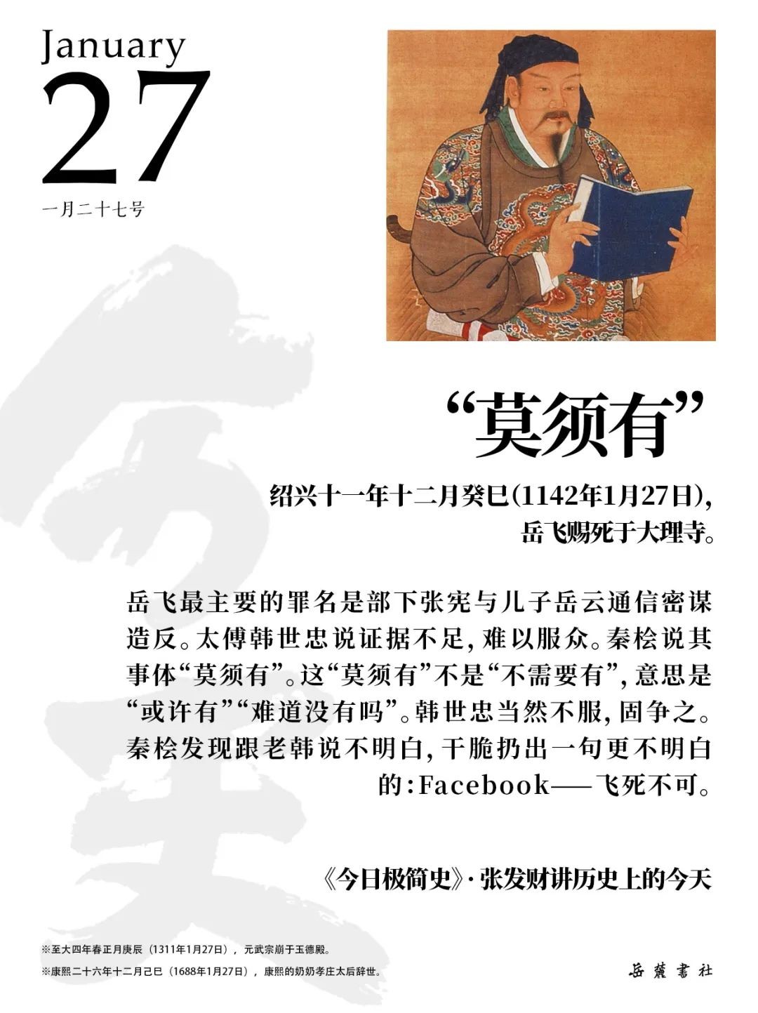 岳飞最主要的罪名是部下张宪与儿子岳云通信密谋造反。太傅韩世忠说证据不足,难以服众。秦桧说其事体“莫须有”。这“莫须有”不是“不需要有”,意思是“或许有”“难道没有吗”。韩世忠当然不服,固争之。秦桧发现跟老韩说不明白,干脆扔出一句更不明白的:Facebook——飞死不可。