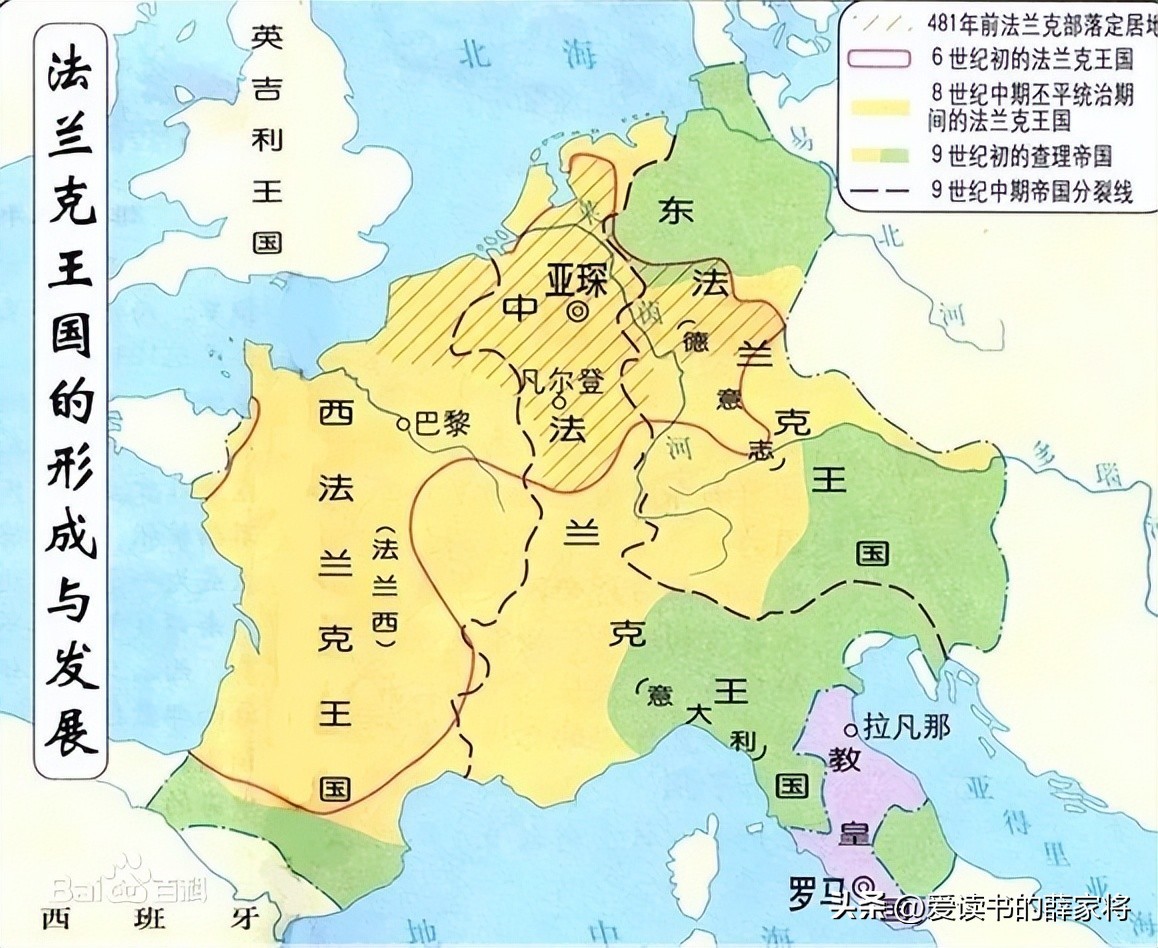 公元486年,一支萨利克法兰克人在首领克洛维率领下,击败罗马帝国军队,占领巴黎和卢瓦尔河以北土地,奠定了法兰克王国的基础。