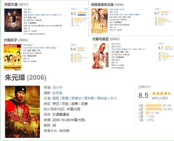 从豆瓣的评分也可以看出来,陈宝国版的朱元璋只有6.7分,而胡军版本的朱元璋却有8.5分。