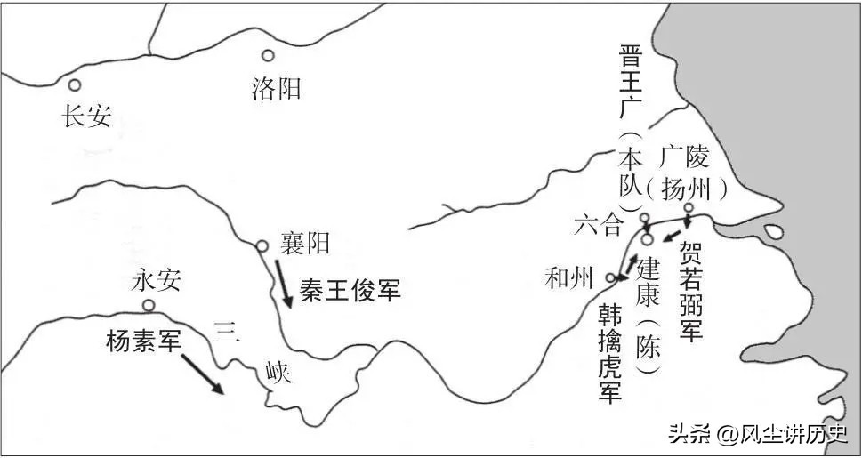公元588年,隋文帝发兵五十一万,命晋王杨广和秦王杨俊分道直取江南。