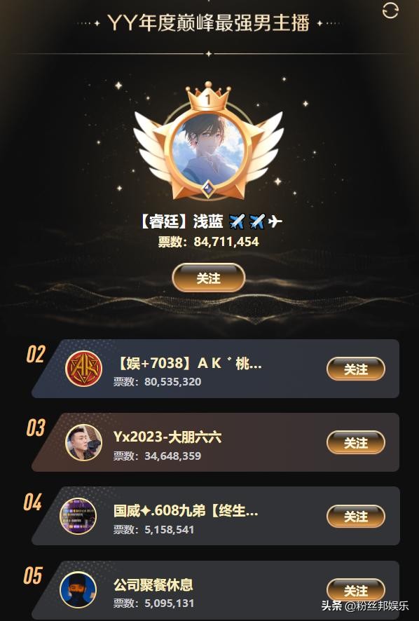 不得不说睿廷主播“浅蓝”真的是太强了,不但在本届年度中以亿票成绩成功拿下“最佳男音乐人”冠军,在终极之战中也是以最高票数稳坐“Top1”主播。