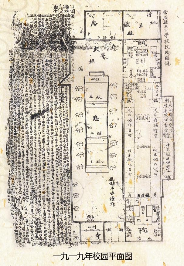 此时求是学堂部分校舍已被挪作县征收局办公地,同年秋因为招收第二班甲组学生,校舍紧张,经辛凯校长多方努力,以县师范传习所校舍与县征收局互换后并入崇庆中学。同年10月县知事公署将毗邻的大悲寺、地藏庵划归崇庆中学。