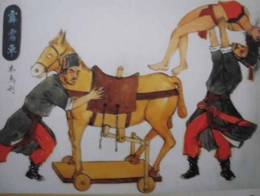 所谓木驴,其实就是一头用木头做成的驴,木驴背上,竖着一根大拇指粗的尖木桩。当女犯被强行按坐下去时,那根尖木桩就直直地刺进了她的下身。