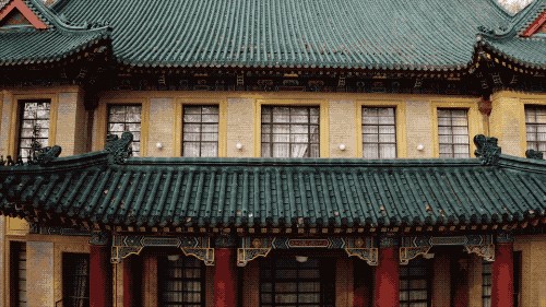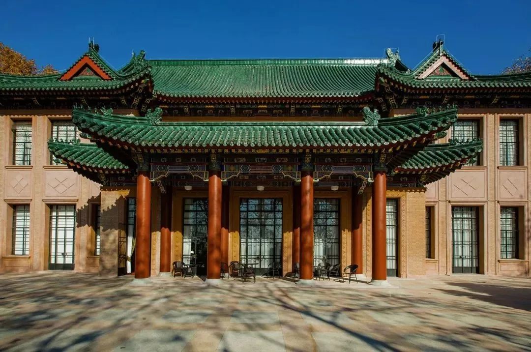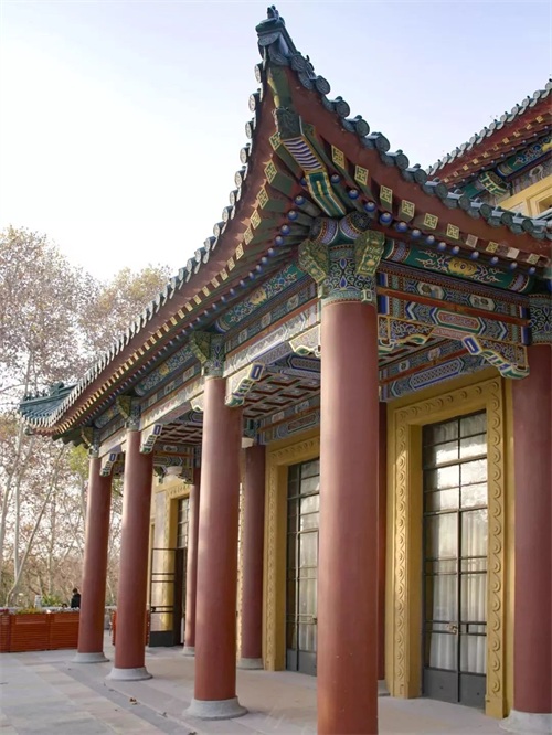 △外观模仿清式宫殿建筑的大屋顶,顶上覆盖蓝绿色琉璃瓦;门廊、腰檐(屋檐)部分,也覆盖上琉璃瓦片,整个流光溢彩、耀人眼目。