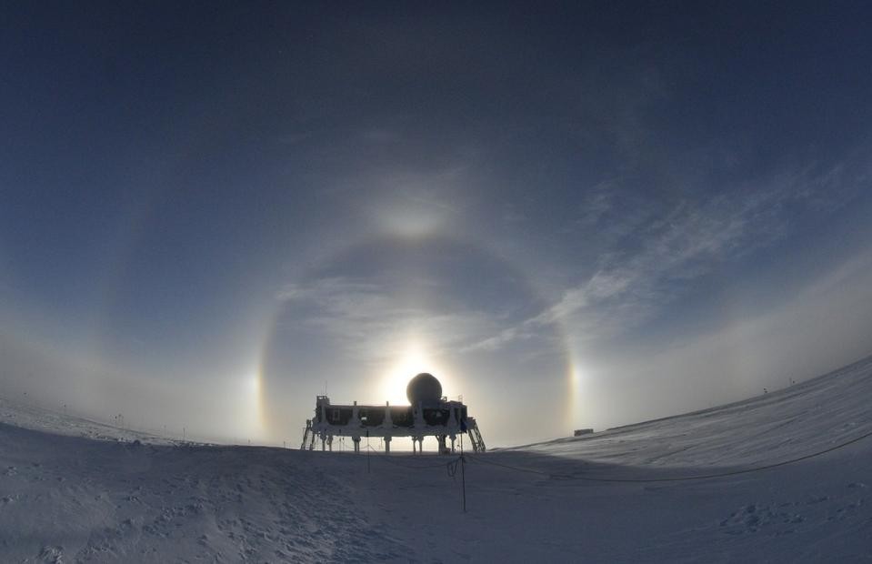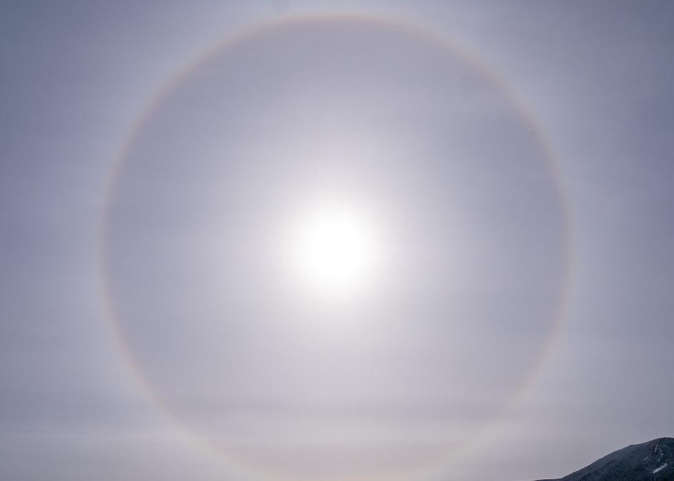 太阳的光晕是由光(通常来自太阳或月球)与悬浮在大气中的冰晶相互作用产生的光学现象。光晕可以有多种形式,从彩色或白色环到天空中的弧线和斑点。其中许多出现在太阳或月亮附近,但其他一些则出现在其他地方,甚至在天空的另一端。