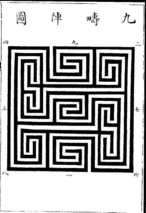 然而洛书的运用远不止此,又有了类似下图的迷宫图,成为《三国演义》小说中,八卦阵的原型。
