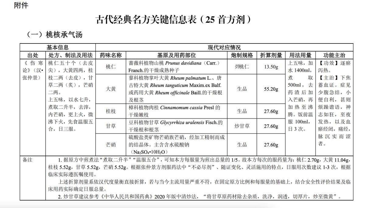 《古代经典名方关键信息表(25首方剂)》,以桃核承气汤为例。