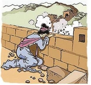 一路上,孟姜女不知经历了多少艰难,吃了多少苦,才来到了长城脚下。谁知修长城的民工告诉她,范杞梁已经死了,尸骨被填进了城墙里。听到这个令人心碎的消息,孟姜女只觉得天昏地暗,一下子昏倒在地,醒来后,她伤心地痛哭起来,只哭得天愁地惨,日月无光。不知哭了多久,忽听得天摇地动般地一声巨响,长城崩塌了几十里,露出了数不清的尸骨。孟姜女咬破手指,把血滴在一具具的尸骨上,她心里暗暗祷告:如果是丈夫的尸骨,血就会渗进骨头,如果不是,血就会流向四方。终于,孟姜女用这种方法找到了范杞梁的尸骨。她抱着这堆白骨,又伤心地痛哭起来。