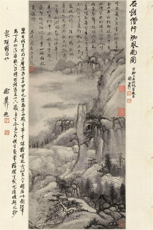 人们常说,画上的丘壑,即画家胸中的丘壑。读髡残的山水画,纸上溪山总让我想到武陵山区。如《行脚风雨图》,可以看成是髡残怀乡之作品。画中山峦起伏,重复层叠,远近分明,云壑幽深,一条山路自下而上,蜿蜒曲折,路旁房屋院落,历历可数,这种画法似元代王蒙的构图法,其用笔之法也颇似王蒙,然只是用笔的大概方法似王蒙,精神状态则有异。丁未年,髡残五十六岁,人渐老渐怀乡,回首往事,感慨世事变迁、人间坎坷。我看纸上山水颇似武陵山水,读款识也能隐隐感觉得到:“丁未夏五月,坐竹关无事,忆余十年前行脚风雨中,每山峰突出相值,溪水傍,人行作互答声。既归而兴到笔随。辄喜有生趣。今老矣,不任此事,觅竹杖亦不知何处。视门外踵相接,犹时时过索。恐东涂西抹,不似阿婆少年时也。因题云:十年老向寺门中,西抹东涂路不通。却忆崎岖风雨里,一条拄杖更谁同。石秃道者画并题。”武陵地区,多风多雨,崇山峻岭常年云雾缭绕。或许,髡残又想起了当年在武陵源逃避兵乱的情形,又模糊又清晰,又悲伤又怀念。