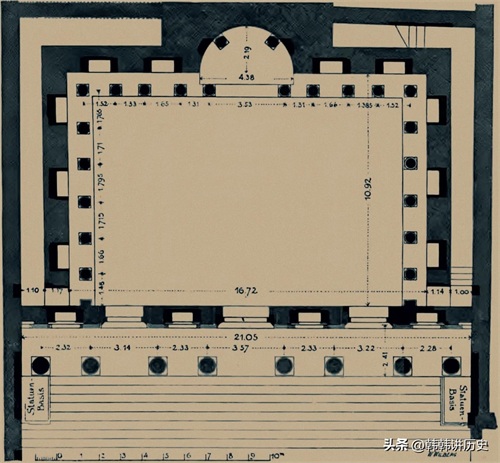 庭院在建成以后又增设了柱廊,中央也铺有大理石板,该建筑的挖掘工作于1933年开始,1935年出现了第一批成果。
