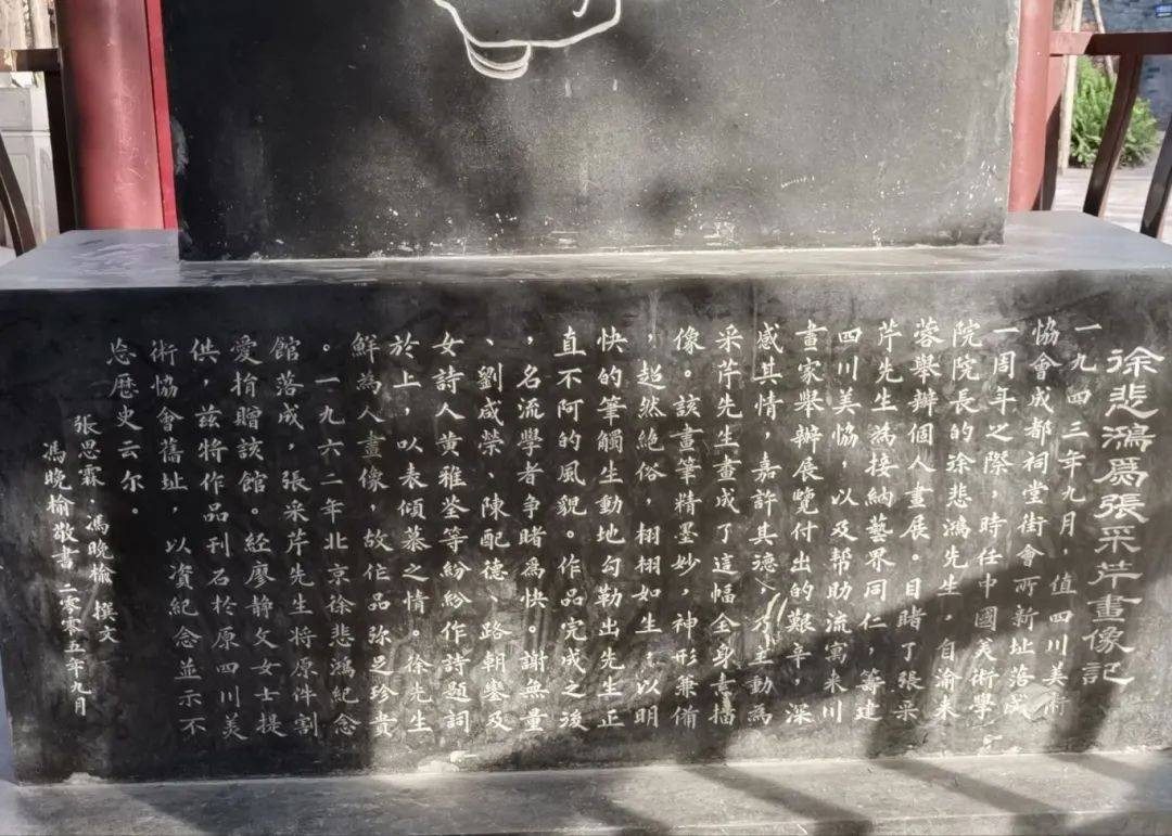 碑的背面赫然刻着张采芹好朋友——大画家、中国美术协会会长徐悲鸿主动为张采芹先生素描艁像,题词全文是:“癸未中秋为采芹道长艁像,悲鸿。”碑座上镌刻着“徐悲鸿为张采芹画像记:1943年9月,值四川美术协会成都祠堂街会所新址落成一周年之际,时任中国美术学院院长的徐悲鸿先生,自渝来蓉举办个人画展。目睹了张采芹先生为接纳艺界同仁,筹建四川美协,以及帮助流寓来川画家举办展览付出的艰辛,深感其情,嘉许其德,乃主动为采芹先生画成了这幅全身素描像。该画笔精墨妙,神形兼备,超然绝俗,以明快的笔触生动地勾勒出先生正直不阿的风貌。作品完成之后,名流学者争睹为快。谢无量、刘咸荣、陈配德、路朝峦及女诗人黄雅荃等纷纷作诗题词于上,以表倾慕之情。徐先生鲜为人画像,故作品弥足珍贵。1962年北京徐悲鸿纪念馆落成,张采芹先生将原件割爱捐赠该馆。经廖静文女士提供,兹将作品刊石于原四川美术协会旧址,以资纪念并示不忘历史云尔。张思霖、冯晚榆撰文,冯晚榆敬书。2005年9月”。