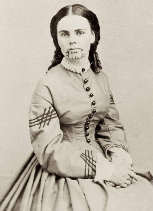 由于担心白人会摧毁他们,莫哈维人将奥利弗带到了尤马堡,那里的军官给她穿上了西式服装,认为她的莫哈维服装(包括裙子和腰部以上没有任何东西)不合适。