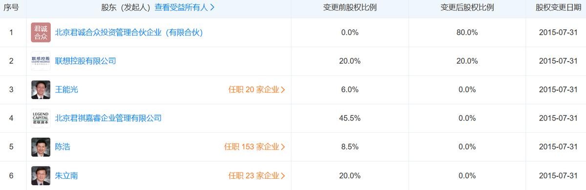 2003年11月19日:北京联想投资顾问有限公司在北京市海淀区注册成立,注册资本仅为100万,朱立南、联想控股分别持有41%和30%。