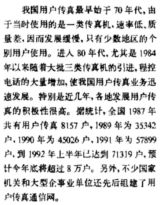 邮电部门登记在册的传真机用户:1992年8.93万户,1993年30.5万户。预计1997年86万户,1998年突破100万户,2000年达到200万户,我国将成为世界最主要的传真机市场。传真机(部/万人):1996年12部,1997年16部。传真机的普及率:1993年欧美国家10%、香港7%。我国普及率小于1%。