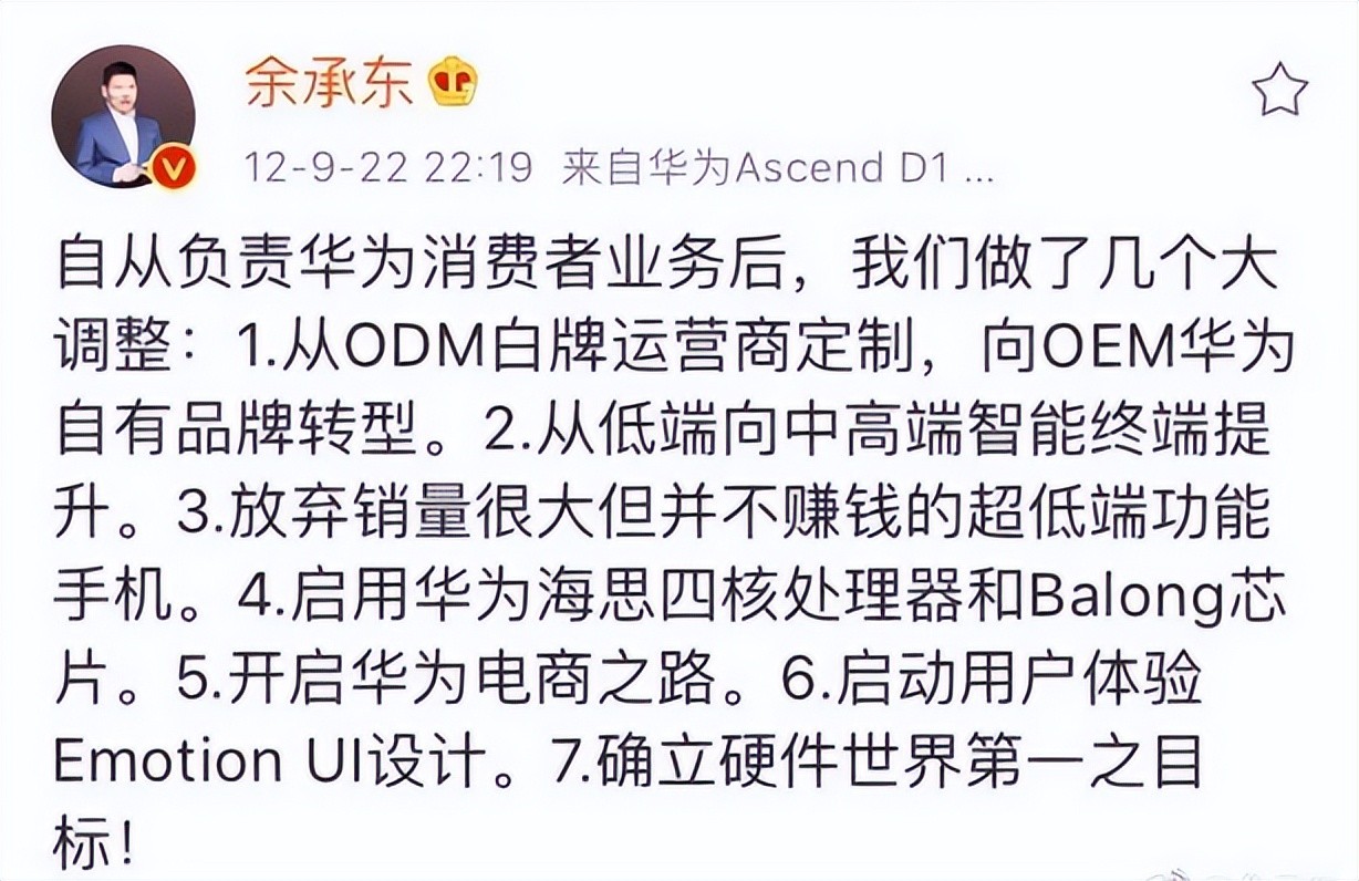 2011年11月:华为三亚会议召开,任正非在会上提出把最终消费者作为方向,建立自己的品牌终端公司,无线业务的华为欧洲总裁余承东担任CEO。余承东直接砍掉很多低端机和功能定制机,遭到内部管理层的反对,欧洲14家运营商中止跟华为的合作,出货量减少千万台,收入锐减。
