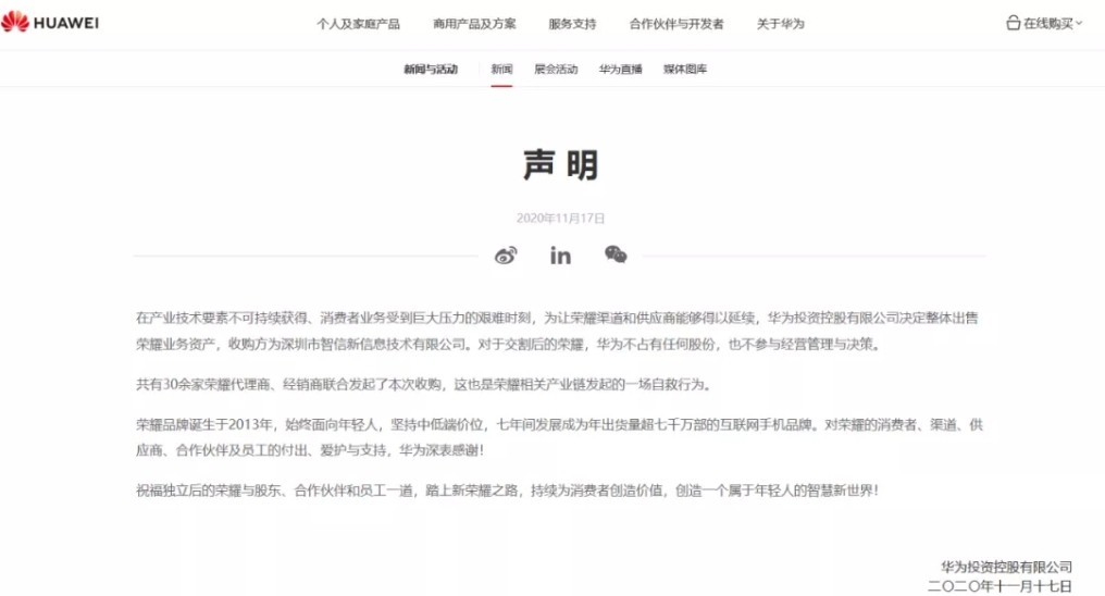 2020年11月17日:华为投资控股有限公司发表声明:整体出售荣耀业务资产,收购方为深圳市智信新信息技术有限公司。对于交割后的荣耀,华为不占有任何股份,也不参与经营管理与决策。
