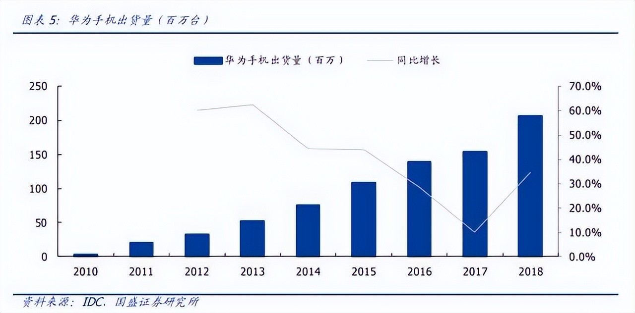 2010年至 2018年:华为手机出货量分别为300万、2000万、3200万、5200万部、7500万、1.08亿、1.39亿、1.53亿和2.06亿部