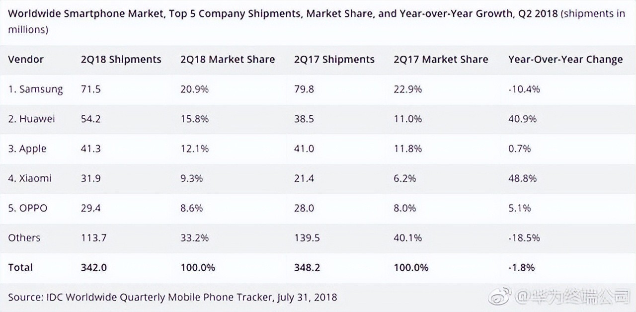 2018年第二季度:华为智能手机全球市场份额跃升至15.8%,首次超越苹果,成为全球第二大智能手机厂商。