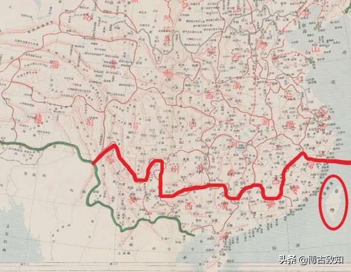 在图中,我们可以明显感觉到:这幅地图比现在的中国地图的形状更胖,特别是在背部的位置,明显有更多肉,鸡头和鸡尾也发生了不小的变化。