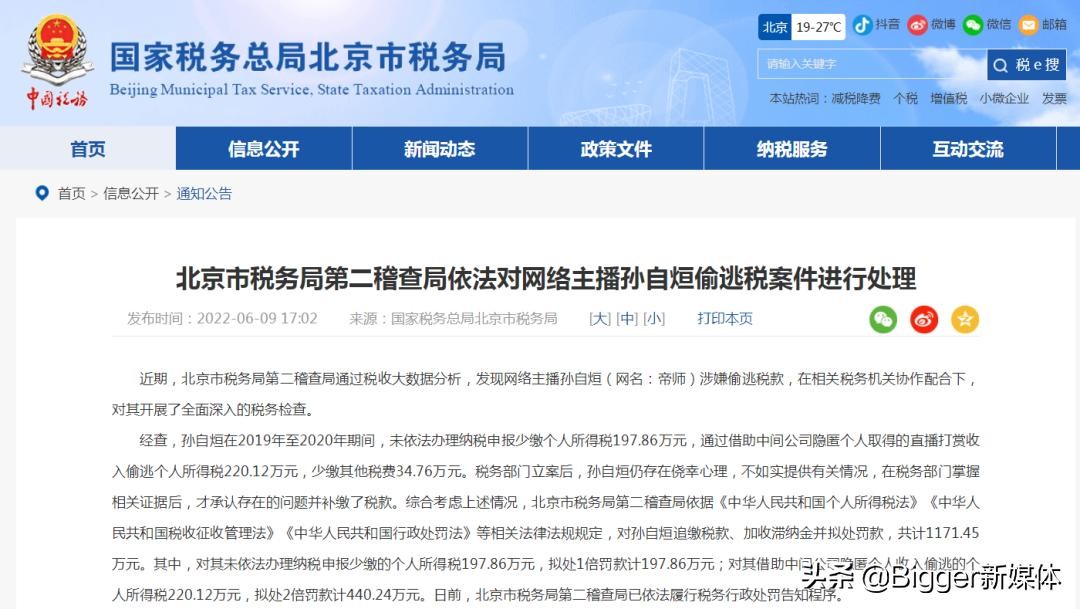 6月9日,北京市税务局通报,发现网络主播孙自烜(网名:帝师)涉嫌偷逃税款,经查,孙自烜在2019年至2020年期间,未依法办理纳税申报少缴个人所得税197.86万元,通过借助中间公司隐匿个人取得的直播打赏收入偷逃个人所得税220.12万元,少缴其他税费34.76万元。税务部门立案后,孙自烜仍存在侥幸心理,不如实提供有关情况,在税务部门掌握相关证据后,才承认存在的问题并补缴了税款。