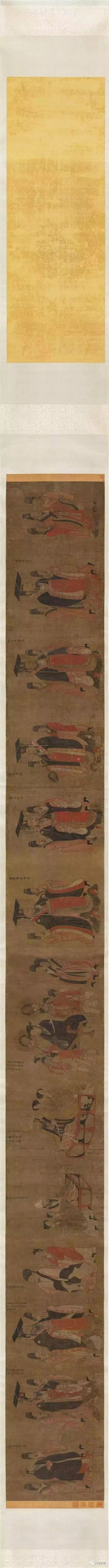 这就得详细地说一说《历代帝王图》了。现藏于美国波士顿艺术馆的《历代帝王图》,是绘在绢上的彩色画。纵51.3厘米,横531厘米。画面上绘制了从汉朝到隋朝的13位帝王。这13位帝王分为13组,每一个帝王身旁有一到两名侍者,加在一起整个画面上有46个人。从古代绘画史的角度看,这种规模的人物画卷是很少见的。