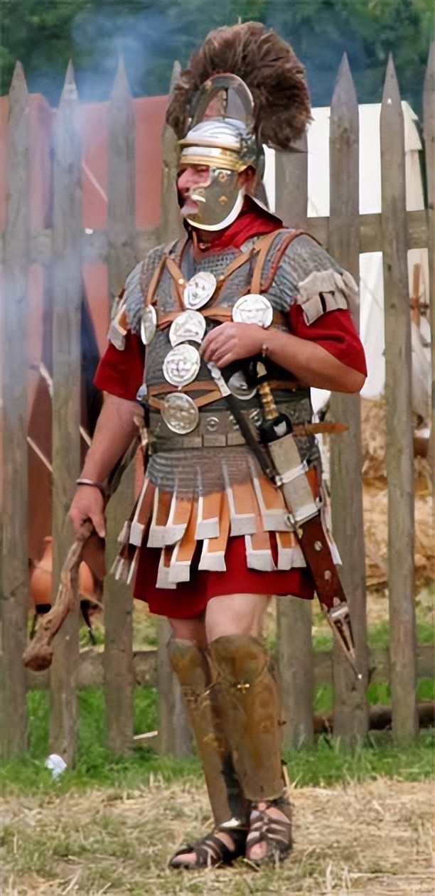 未受保护的区域,如腹股沟和手臂,由悬挂的皮条保护。到公元1世纪,盔甲设计的进步意味着短袖环甲背心已成为大多数百夫长的首选盔甲。