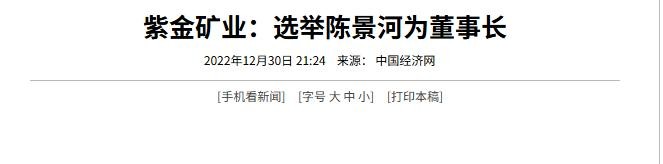 《紫金矿业:选举陈景河为董事长》中国经济网
