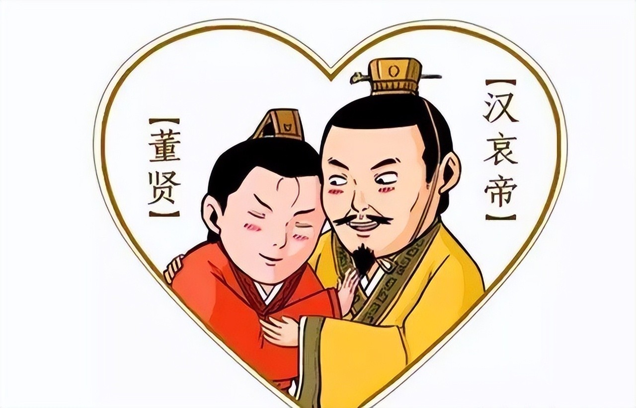 有一天,二人午睡,哀帝比董贤醒得早,想起床,但是袖子被董贤压在身子底下。看到董贤的艳美睡姿,哀帝心生爱怜,不忍将董贤叫醒,悄声拔刀把自己的衣袖割断,从此同性之恋多了一个别号——断袖之癖。