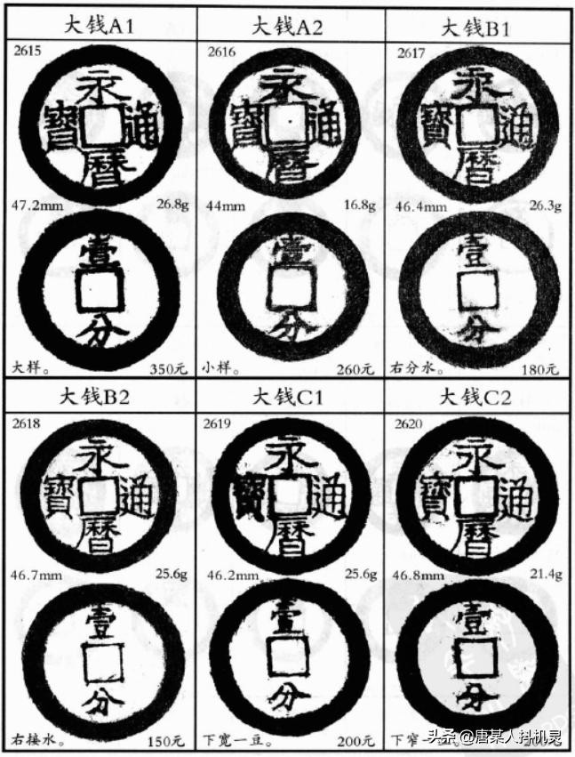 折十和折五钱,永历通宝的折十钱背有纪值“壹分”,折五钱背纪值“五厘”。其中折十钱背“壹分”有大钱和小钱两种,大钱尺寸在45mm附近,而小钱的尺寸在35mm附近,大钱相对少所以价格相对较高,小钱比较常见,目前的成交价在小百到中百之间。而折五钱背“五厘”尺寸在32mm上下。