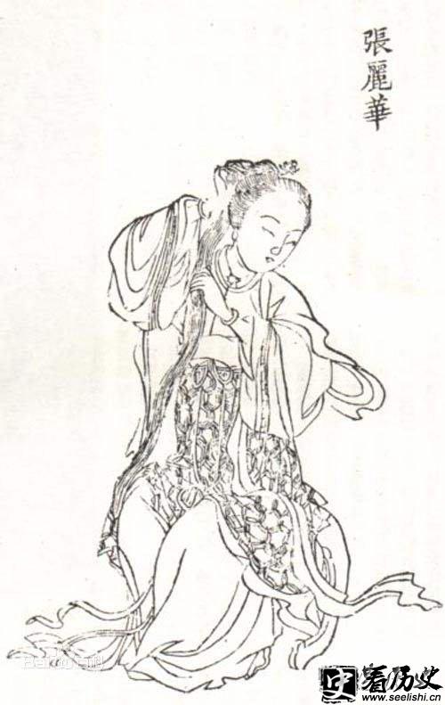 歌妓出身的张丽华后来做了是南朝陈后主的贵妃,她长相上最大的特点是发长七尺,光可鉴人,眉目如画。此外,更具有敏锐才辩及过人的记忆力,所谓“人间有一言一事,辄先知之。”她在做龚贵嫔的侍儿时,陈后主一见钟情,封为贵妃,视为至宝,以至于陈后主临朝之际,百官启奏国事,都常常将张丽华放在膝上,同决天下大事。特别是张丽华为他生下一个儿子之后,立即立为太子,张丽华在他心目中的地位更加提高、巩固和加强。