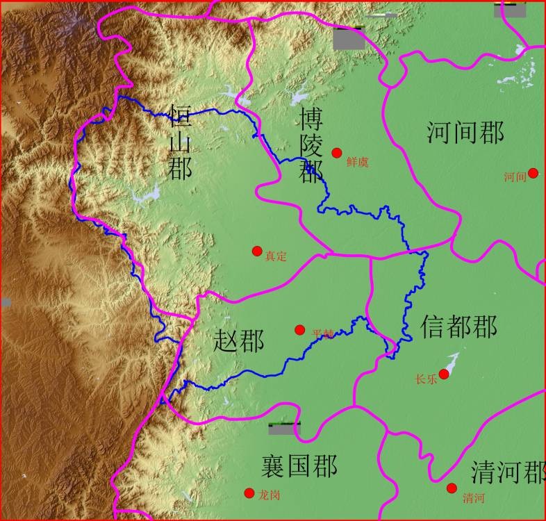 隋朝统一全国后,改常山郡为恒山郡,治为真定。石家庄地区分为赵郡(治平棘)、博陵郡(治鲜虞)。信都郡(治长乐)、恒山郡(治真定)。