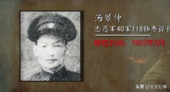第六位:汤景仲,志愿军第40军118师参谋长,山东省寿光县孙家集街道汤家庄人,1952年5月份其所在的118师接防第64军防务,随后其与师长在策划修筑防御工事时,遭遇敌机空袭而壮烈牺牲,年仅35岁。