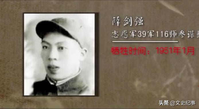 第四位:薛剑强,志愿军第39军116师参谋长,江苏省淮安市涟水县方渡乡人,1951年1月份,在釜古里战斗中壮烈牺牲,年仅30岁,后朝鲜为了纪念他的功勋,将釜古里山更名为剑强岭。
