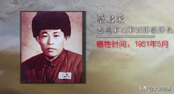 第八位:蔡启荣,志愿军第12军35师副师长,河南省商城人,1951年5月的17号,他壮烈牺牲,年仅32岁。