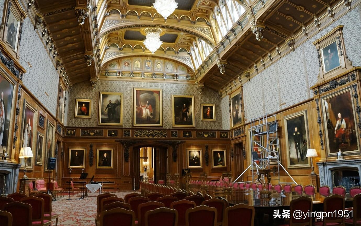 在宽敞高大的长方形大厅内,墙壁上挂满在滑铁卢战役中立下战功的英国战将的肖像,屋顶上悬挂着巨大的花形水银吊灯。