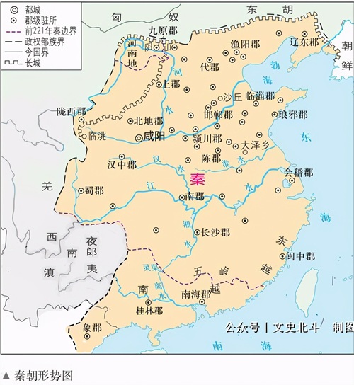 秦朝建立之时,中国还未完全统一,因为原来赵国开拓的河套平原被匈奴占据了,百越之地还未统一。前219年,秦始皇开始派遣大军南征百越,几经波折,终于在前214年征服百越,设置了南海、桂林、象郡。前215年,秦始皇又派遣蒙恬大军北伐匈奴,收复了河套平原,并且在此修建长城,屯田,设置五原郡。