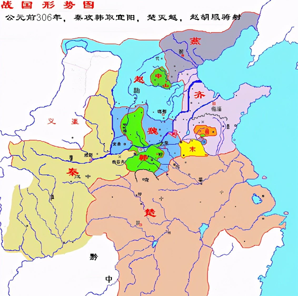 前311年,秦武王继位。他在位时间不长,唯一的功绩就是夺取了宜阳,兵临洛阳。正当秦武王准备对周天子取而代之的时候,秦武王就在举鼎中被压死了。该时期,楚国开始出现了复兴的态势,向东消灭了越国。北方的赵武灵王也进行“胡服骑射”,吞并了中山、林胡等,将疆域推向河套平原,直接威胁秦国后方。该时期东方最强的还是齐国。