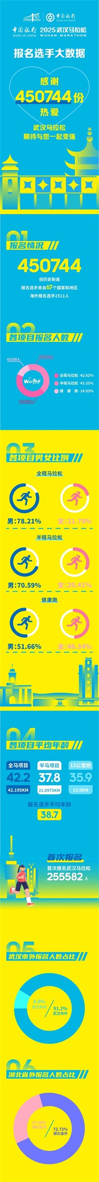 武汉马拉松组委会发布的报名选手大数据显示,2025武汉马拉松共吸引了450744人报名,创下了历史新高。报名选手来自67个国家和地区,海外报名选手2511人。其中报名人数最多的为全程马拉松,共有195416人报名,其次为半程马拉松,报名人数为192089人,健康跑报名人数为63239人。