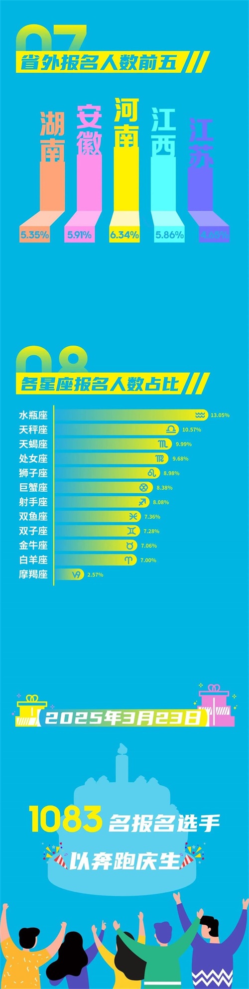 从各项目报名的男女比例上看,男子选手均超过了女子选手。值得关注的是,本次赛事报名选手的平均年龄为38.7岁,首次报名武汉马拉松的选手达到了255582人。报名选手中,共有1083名选手的生日与2025武汉马拉松的比赛日在同一天。
