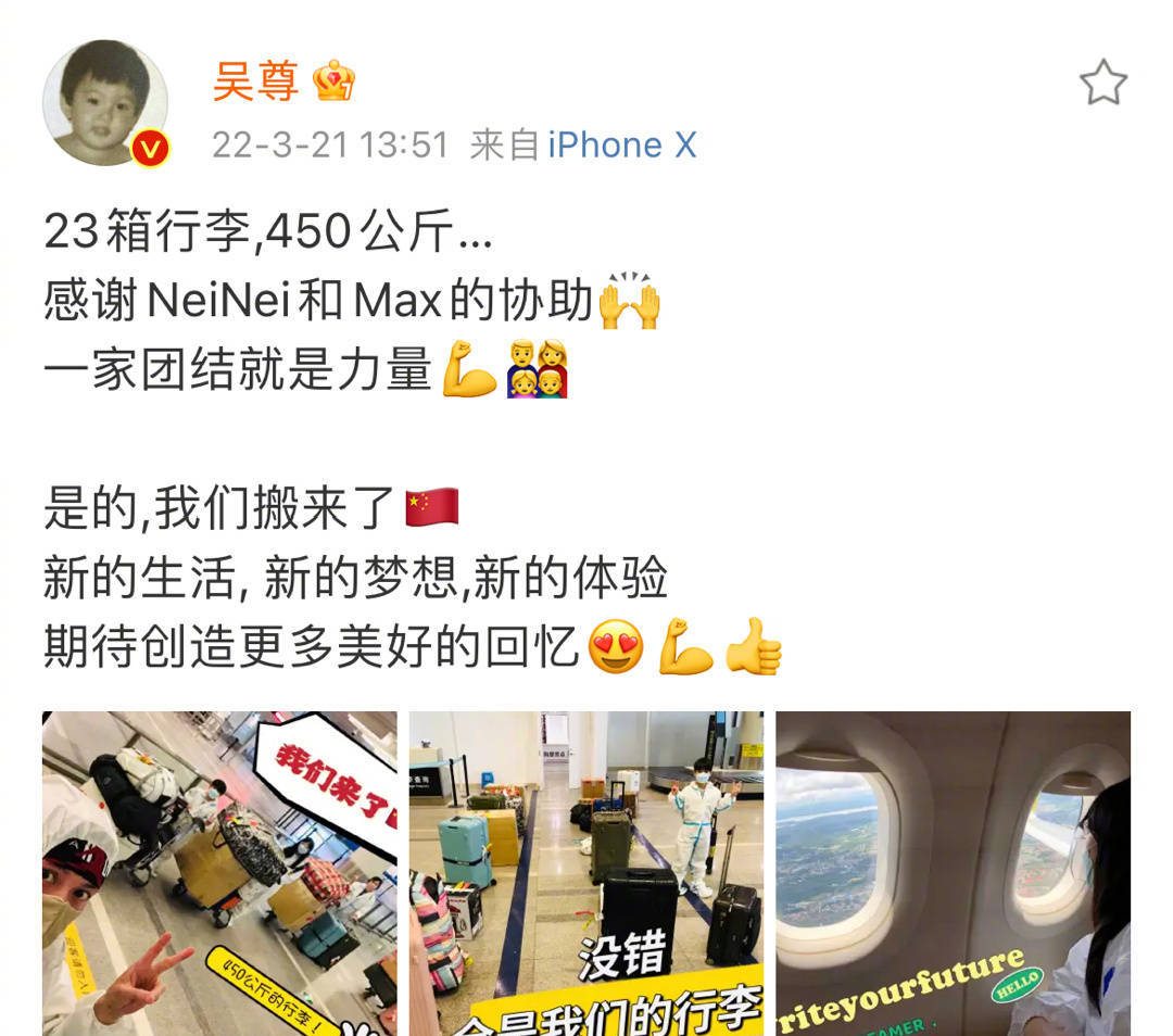 吴尊发文透露,他们已经在搬家的路上,全家人一共搬了23箱行李,基本上整个机场都被他们家包了。