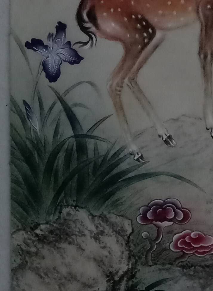 画中的梅花鹿看上去毛皮光洁润泽,有一种触手生暖的感觉,这就是董丽霞老师在设色中注意到了色彩的明暗,通过加深阴影部分,体现出梅花鹿身上的高光部分。
