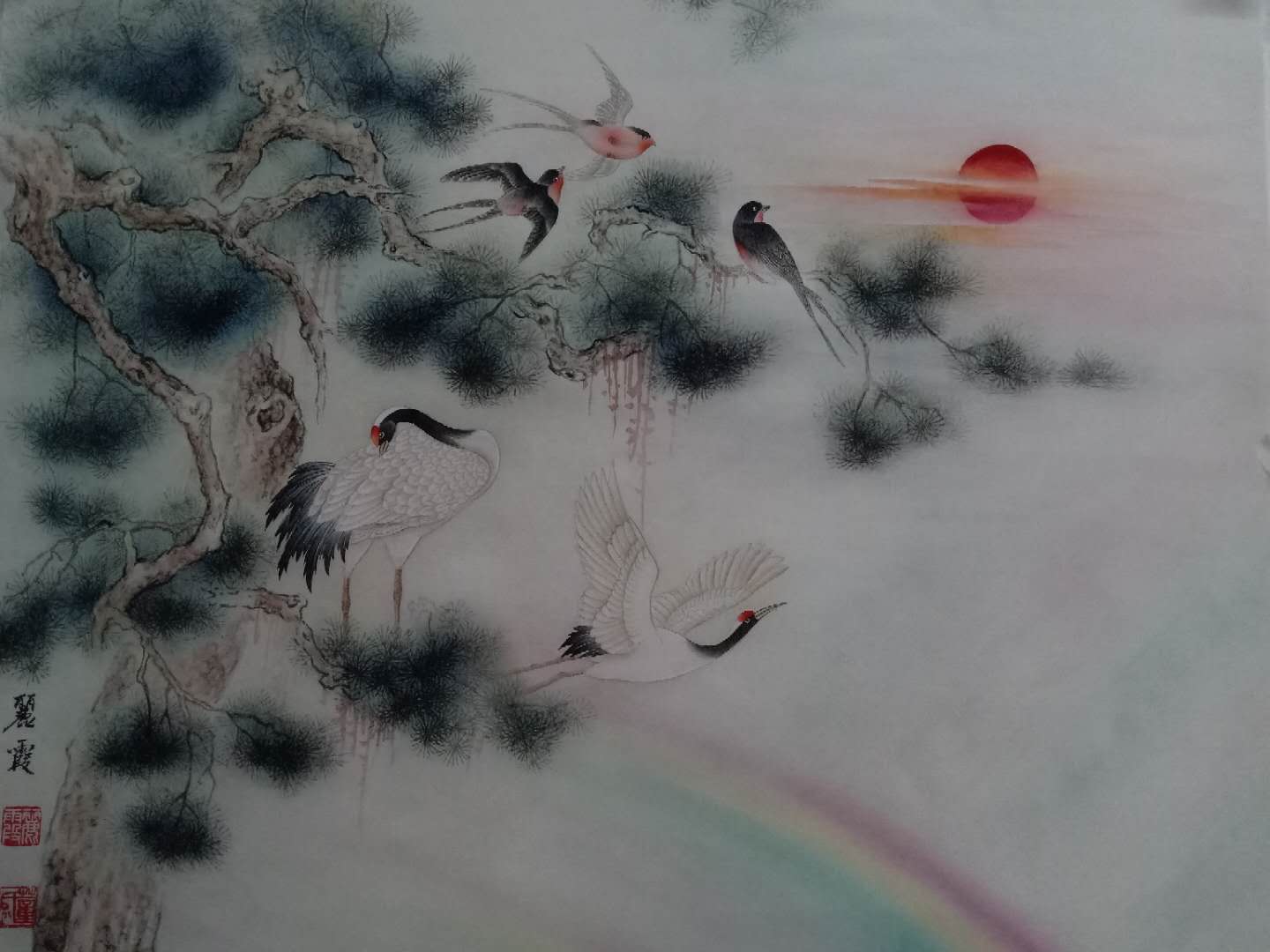一只仙鹤站立在高高的松树之上,一只翱翔于彩虹之上,松树上几只燕子在嬉戏,山岩溪涧旁边长有仙草、灵芝。