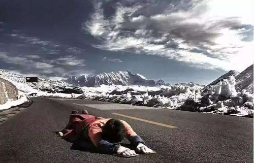 “磕长头”分为长途(行不远数千里,历数月经年,风餐露宿,朝行夕止,匍匐于沙石冰雪之上,执著地向目的地进发)、短途(数小时、十天半月)、就地三种。