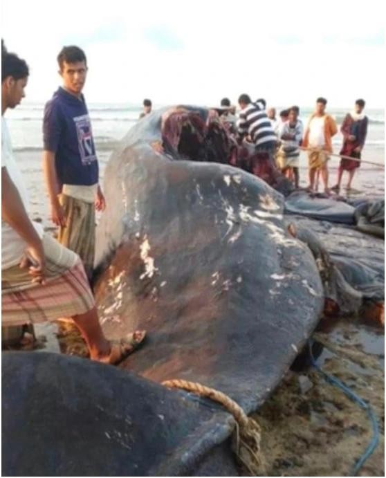 雅虎新闻6月4日报道,6月3日,也门一群渔民捕获了一头抹香鲸,他们发现抹香鲸的肚子里有一块280磅(127公斤,254斤)重的龙涎香。