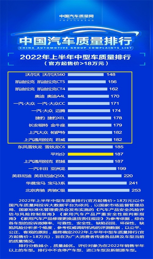 再来看下B级车(起售价大于18万)质量榜六至十名,依次为大众迈腾、捷豹XEL、福特金牛座、大众帕萨特以及别克君威,其中有三款主流车型,分别是迈腾、帕萨特以及君威,它们的月均销量都能达到万辆以上,市场认可度也蛮高。不过捷豹XEL排名第七,福特金牛座位居第八,而且它们的排行分数都低于180分,就有点让人想不通了,虽说它们的品质表现也还不错,但它们的市场表现都很糟糕,捷豹XEL的内饰,福特金牛座的电子产品,或多或少都有让人诟病的地方。
