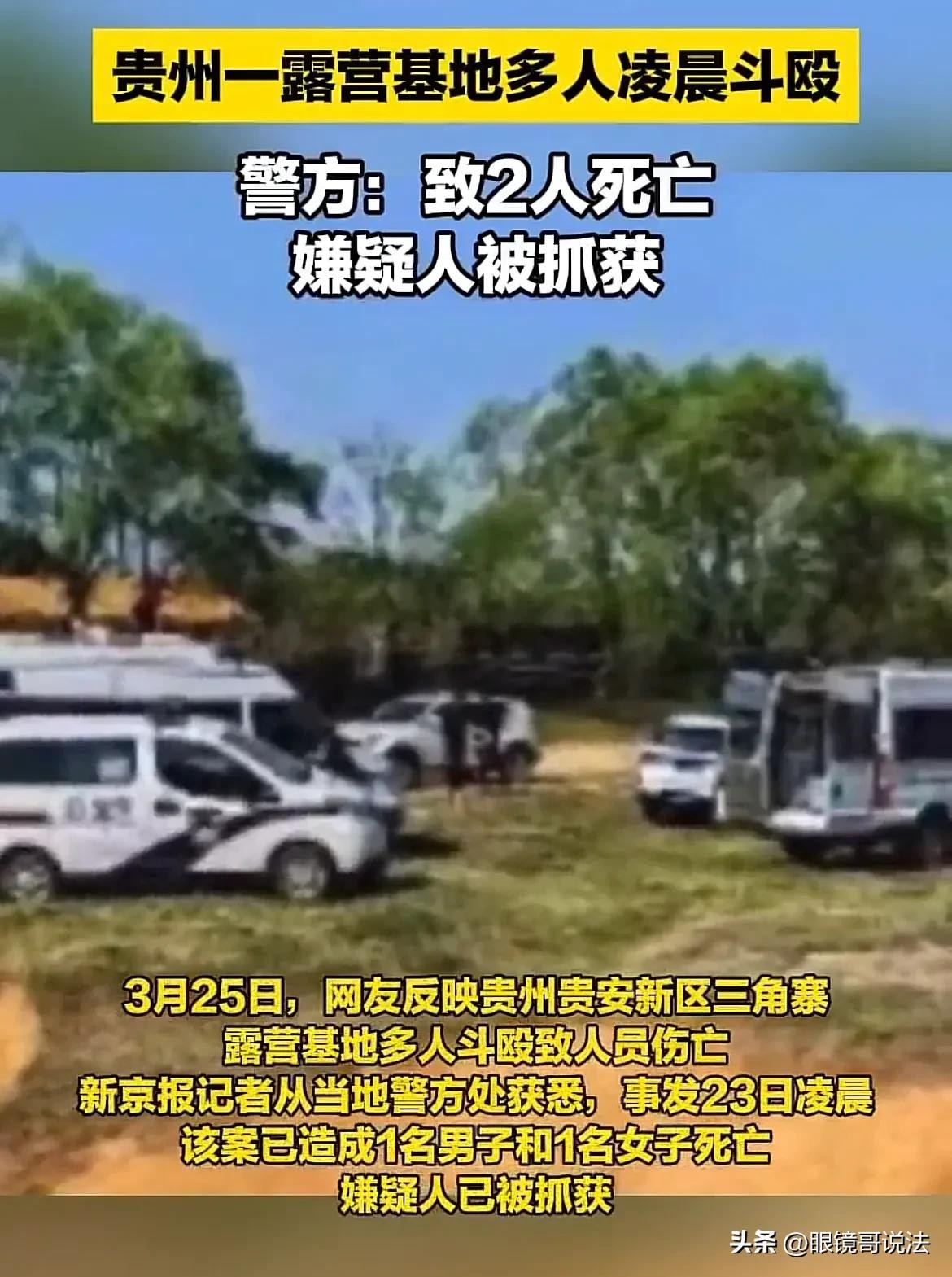 3月25日,在贵州贵安新区的一个露营基地,凌晨时发生多人斗殴。从当地警察处得知,有两人死亡,分别是一名男子和一名女子,目前犯罪嫌疑人已被抓获!案件在调查当中!