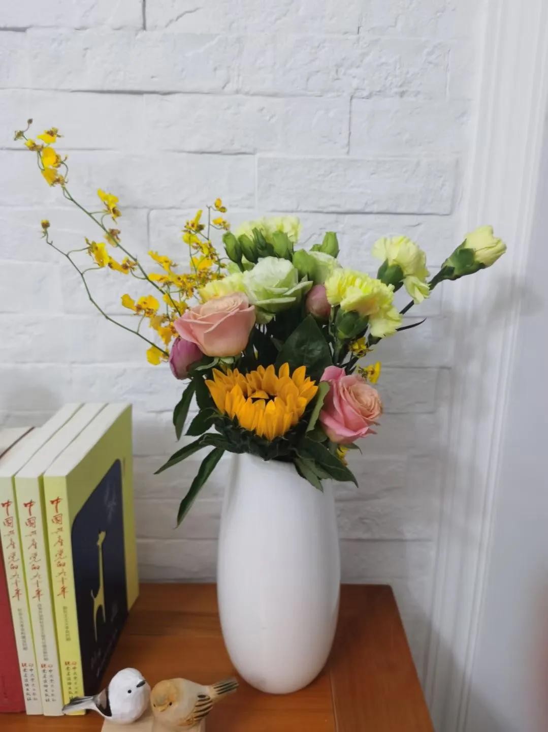 9、向日葵、玫瑰、文心兰、康乃馨的组合插花,看起来很温暖。