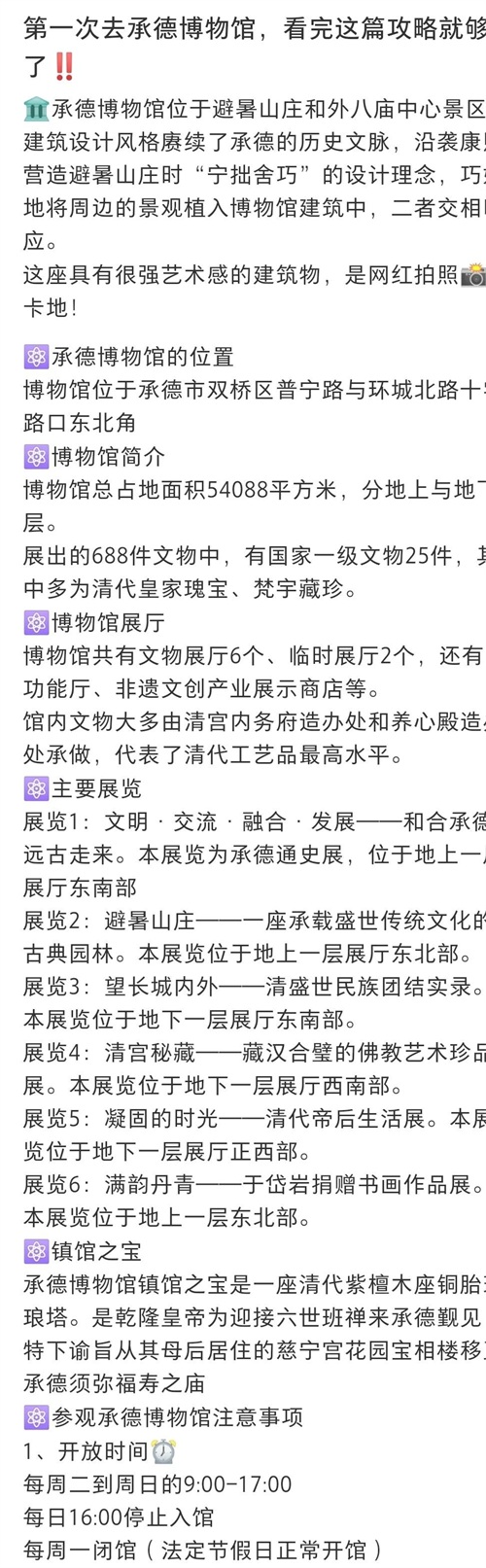 承德博物馆是一座综合性博物馆,收藏了大量的历史文物和艺术品,展示了承德市的历史文化和风土人情。